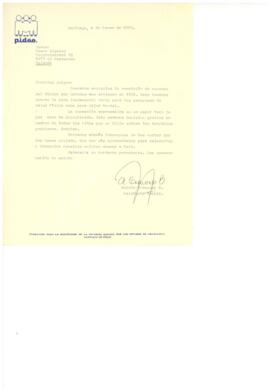 Carta enviada por PIDEE al señor Franc Diamond agradeciendo el dinero enviado a Chile para fortalecer los programas de salud física y mental que desarrolla PIDEE